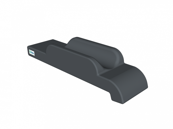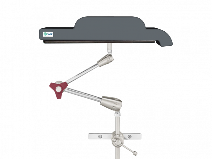 Appui-bras pour décubitus latéral 450mm avec plaque spécifique plus large (150mm). Triple articulation à blocage central, rayon d'action 560mm + tige 220mm avec clameau radial imperdable. Coussin à mémoire de forme spécifique avec bord relevé de 40mm sur une partie des côtés (longitudinaux) et avec léger retour sur une extrémité pour protection du coude et sangle inclus.